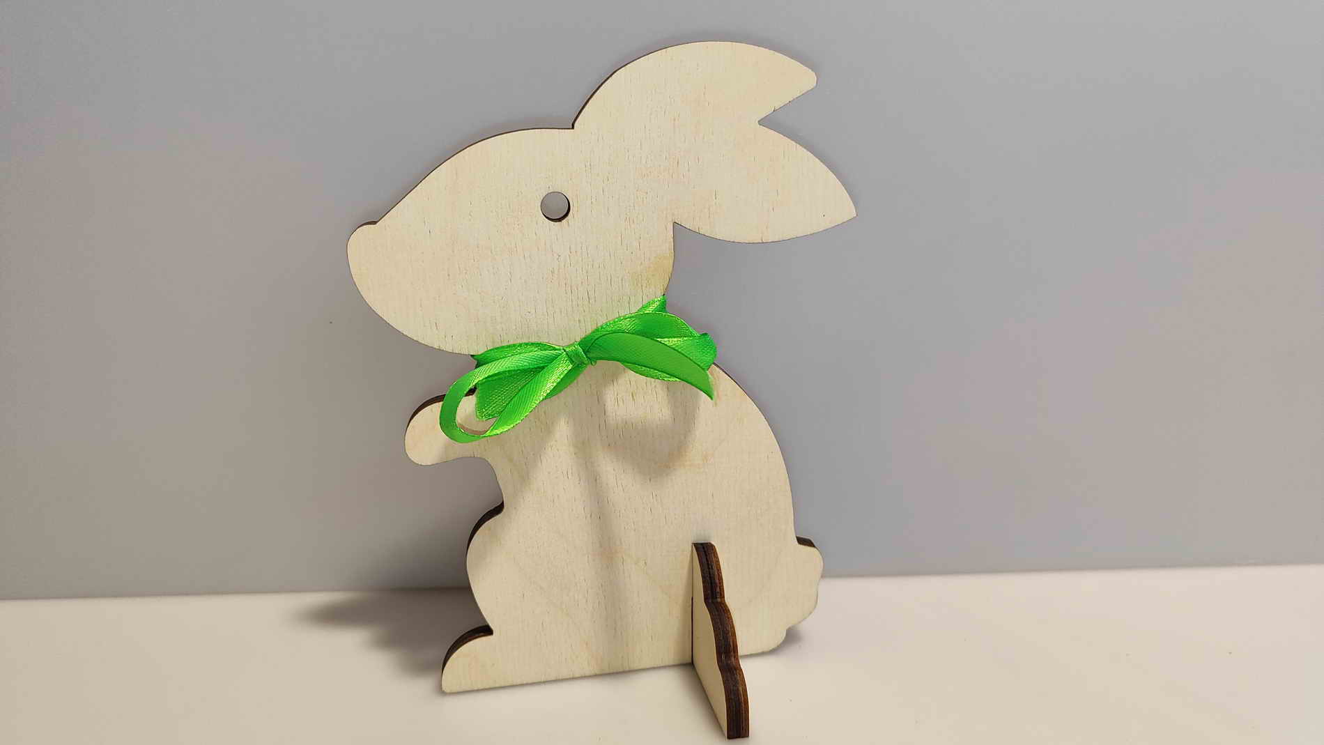 Zajíček je vyroben z kvalitního dřeva a doplněn svěží zelenou mašličkou, která mu dodává hravý a elegantní vzhled.