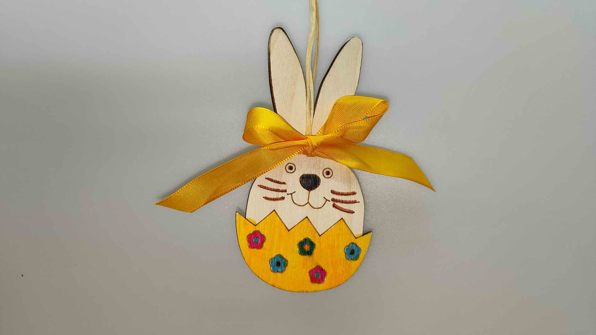 Závěsné dekorace: Zajíčci v kraslici s dírkou na provlečení šňůrky. Skvěle se vyjímají na jarních větvičkách (kočičkách, zlatém dešti) nebo jako ozdoba na dveře.